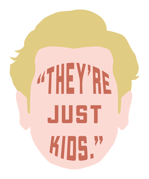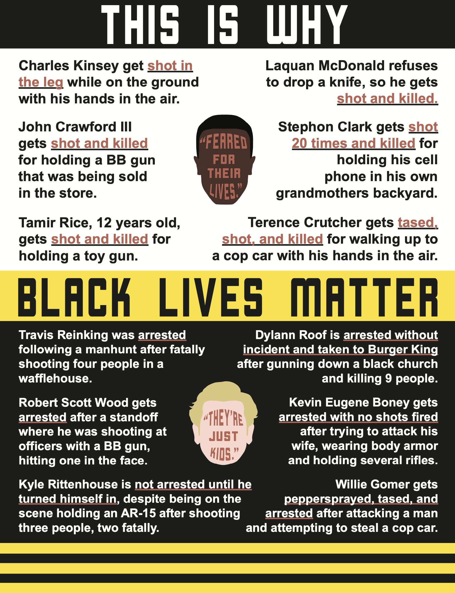 I used a stereotypical white mans silhouette for this graphic, also putting the words inside his face. Many times when a white man is taken into custody for crimes he’s committed, the police excuse it stating he’s “just a kid,” even if he poses a significant threat.