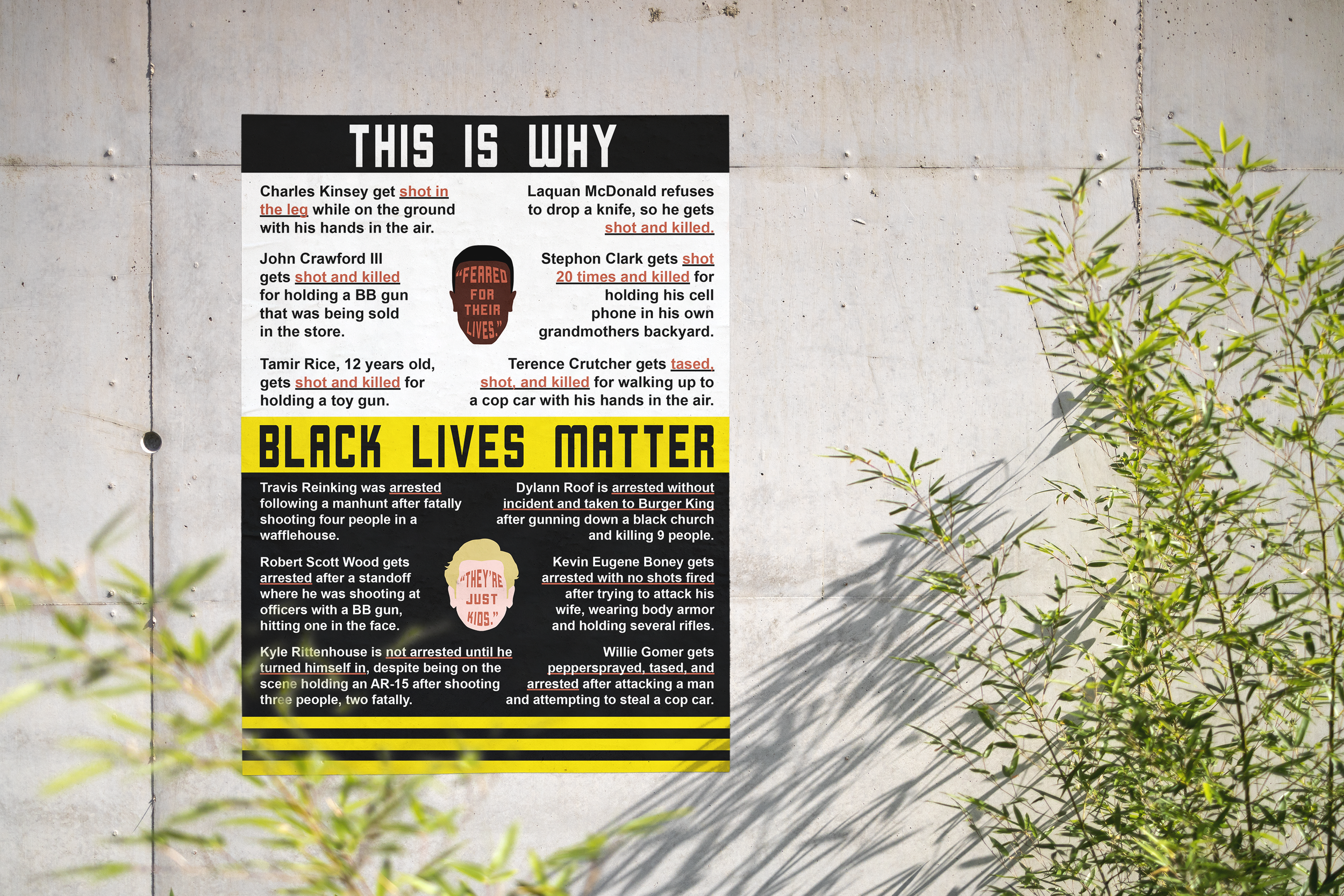 The Black Lives Matter movement uses a lot of imagery of three equal stripes, often in this yellow color. I started this project in high school before the movement was ‘mainstream’ so I added these stripes to tie the poster in with the movement.