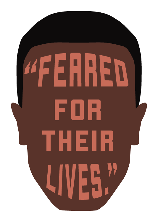 I used a stereotypical black mans silhouette for this graphic, putting the words inside his face. Many of the cops who murder black men and children on the job use the excuse they “feared for their lives” as a reason for their killing, even if the person of color posed no threat.