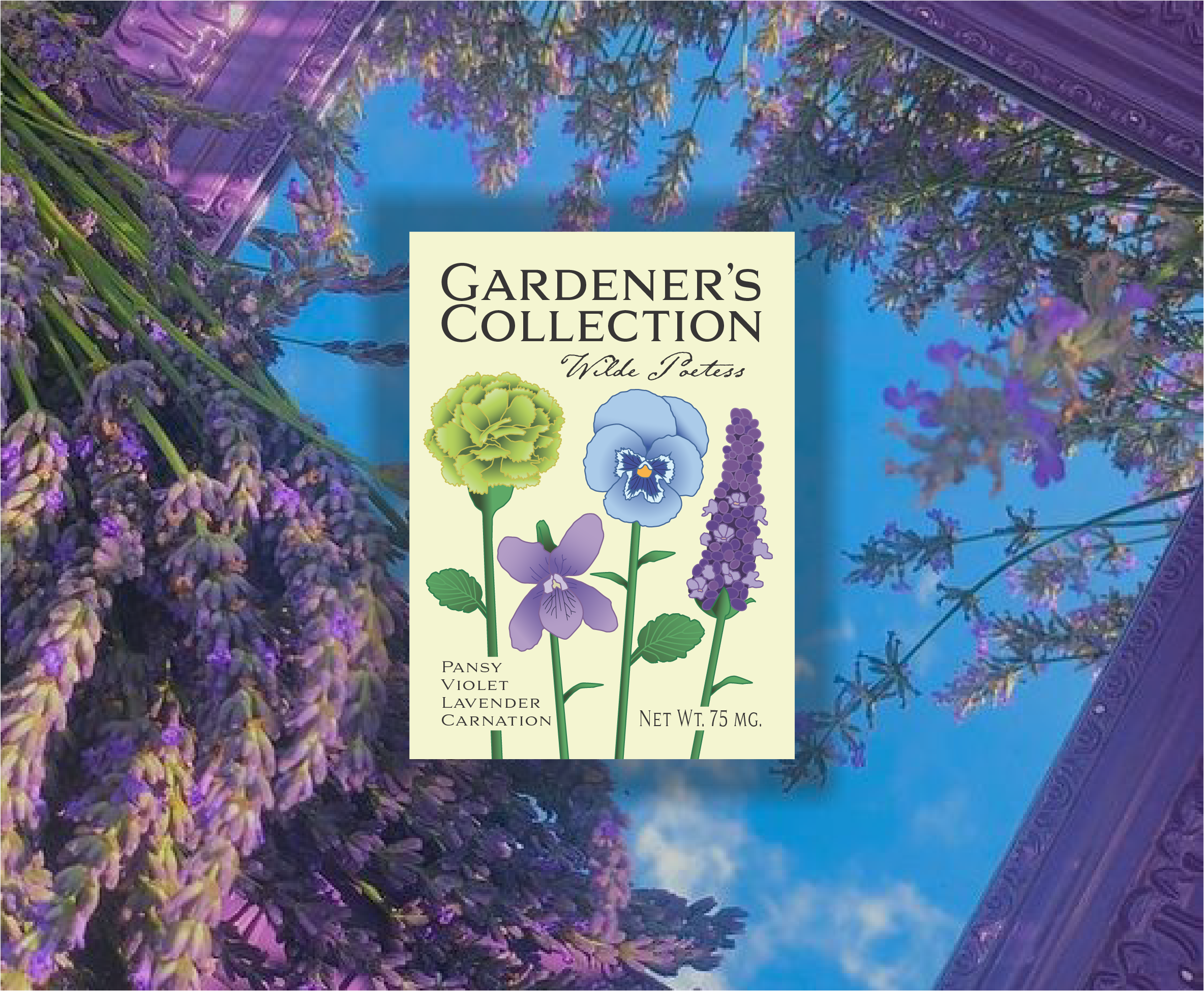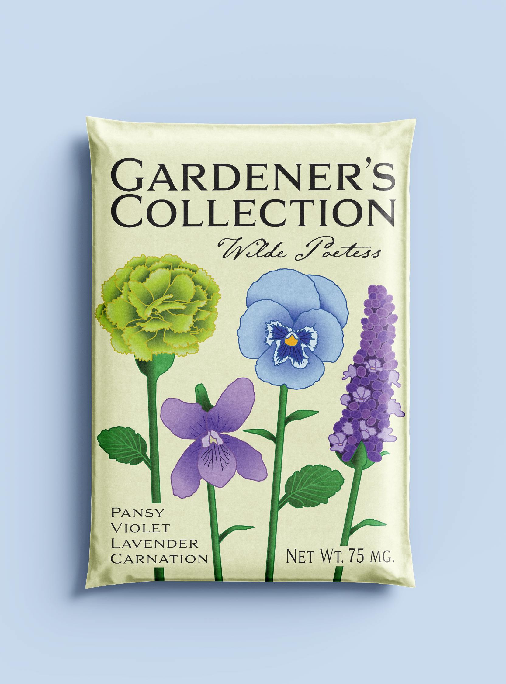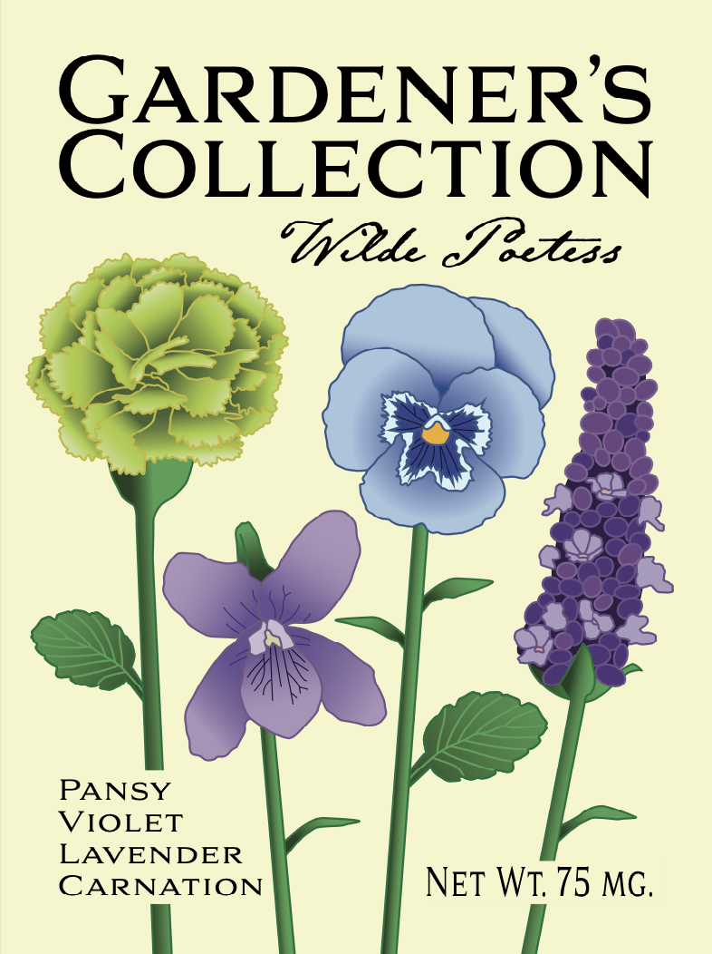 This design came from a school project where we were tasked with creating a design for a garden seed package. The required information was the oz., “Gardener’s Collections” as the brand, and at least one illustrated flower. I decided to make a seed mix based off of queer histories and literature. The mix name “Wilde Poetess” comes from Oscar Wilde, an influential gay playwright from the mid to late 1800s, and Sappho, an lesbian and an Archaic Greek poet who was given the nickname ‘The Poetess’ for her lyrical style of poetry. This entire design was created using Illustrator.