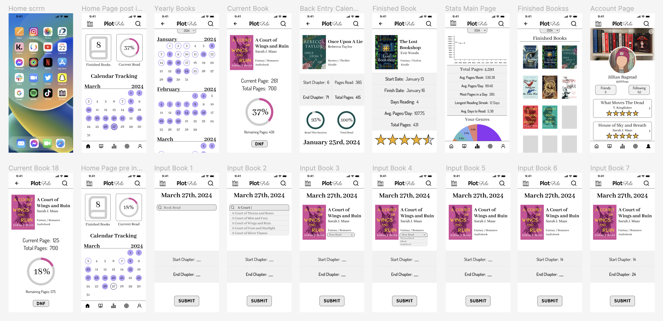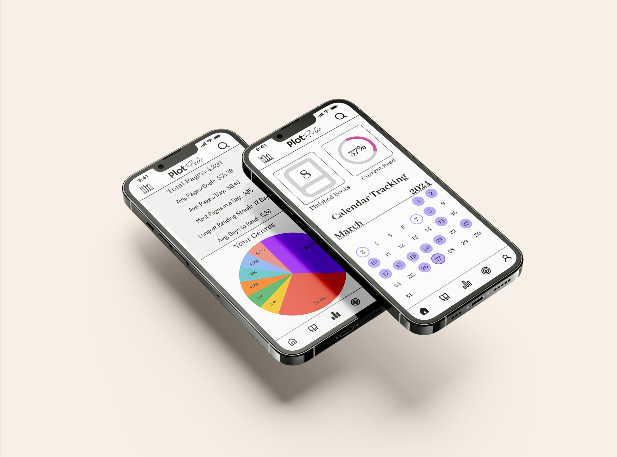 PlotFolio is the app concept I designed during an app development class. We did a partial case study on the needs of our chosen clientele. My clients were book lovers who wanted to track their reading and their statistics more in depth than current book tracking apps allow. I looked at both positive and negative reviews of popular book tracking apps in order to figure out what the people enjoyed and what they wish was added or different about their favorite apps. This app would work effectively for both people long into their reading hobby who want to track their progress, and also for people who are just reigniting their passion for reading and want to use this app to help them figure out what they like and what their reading habits are.