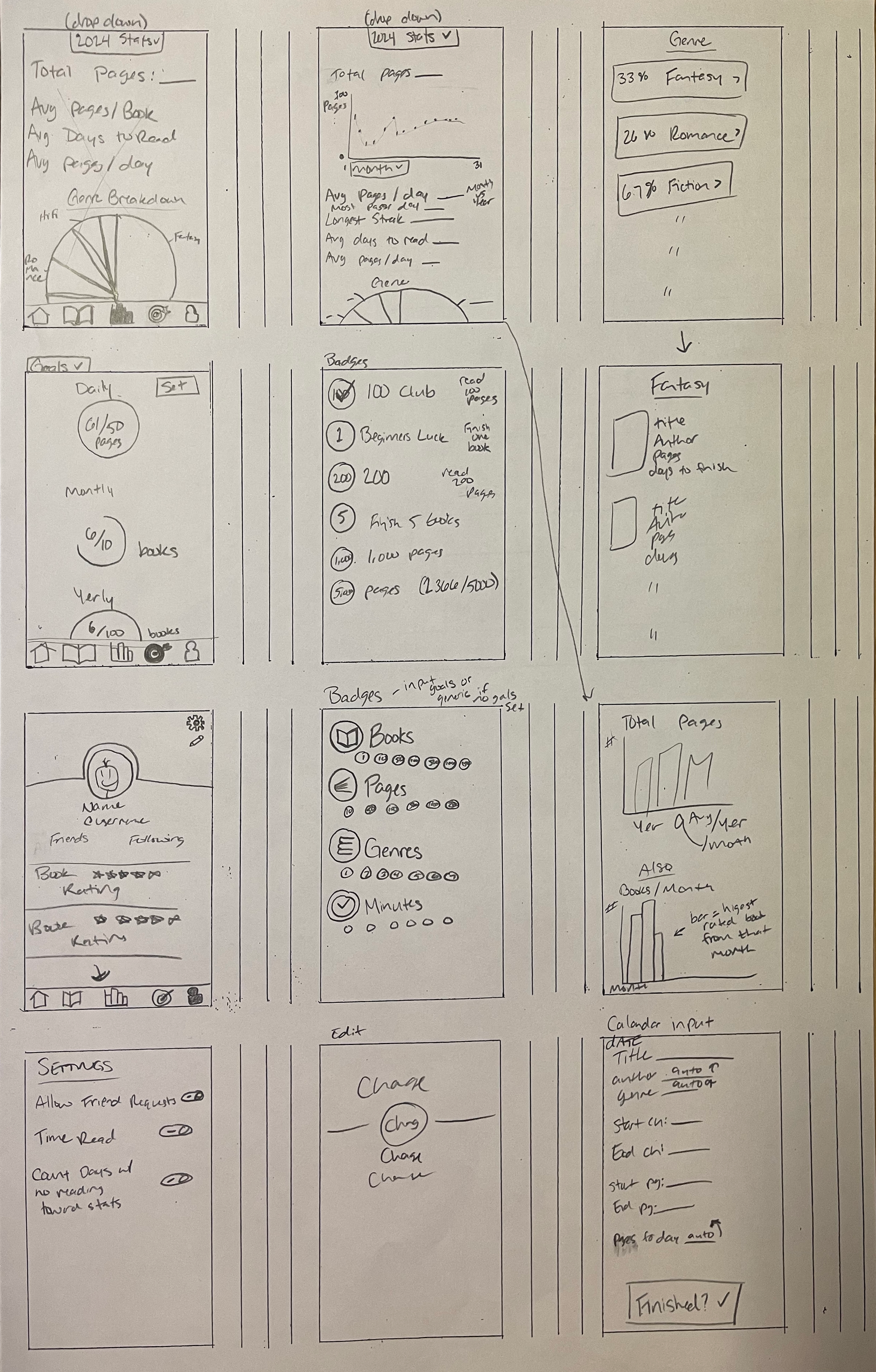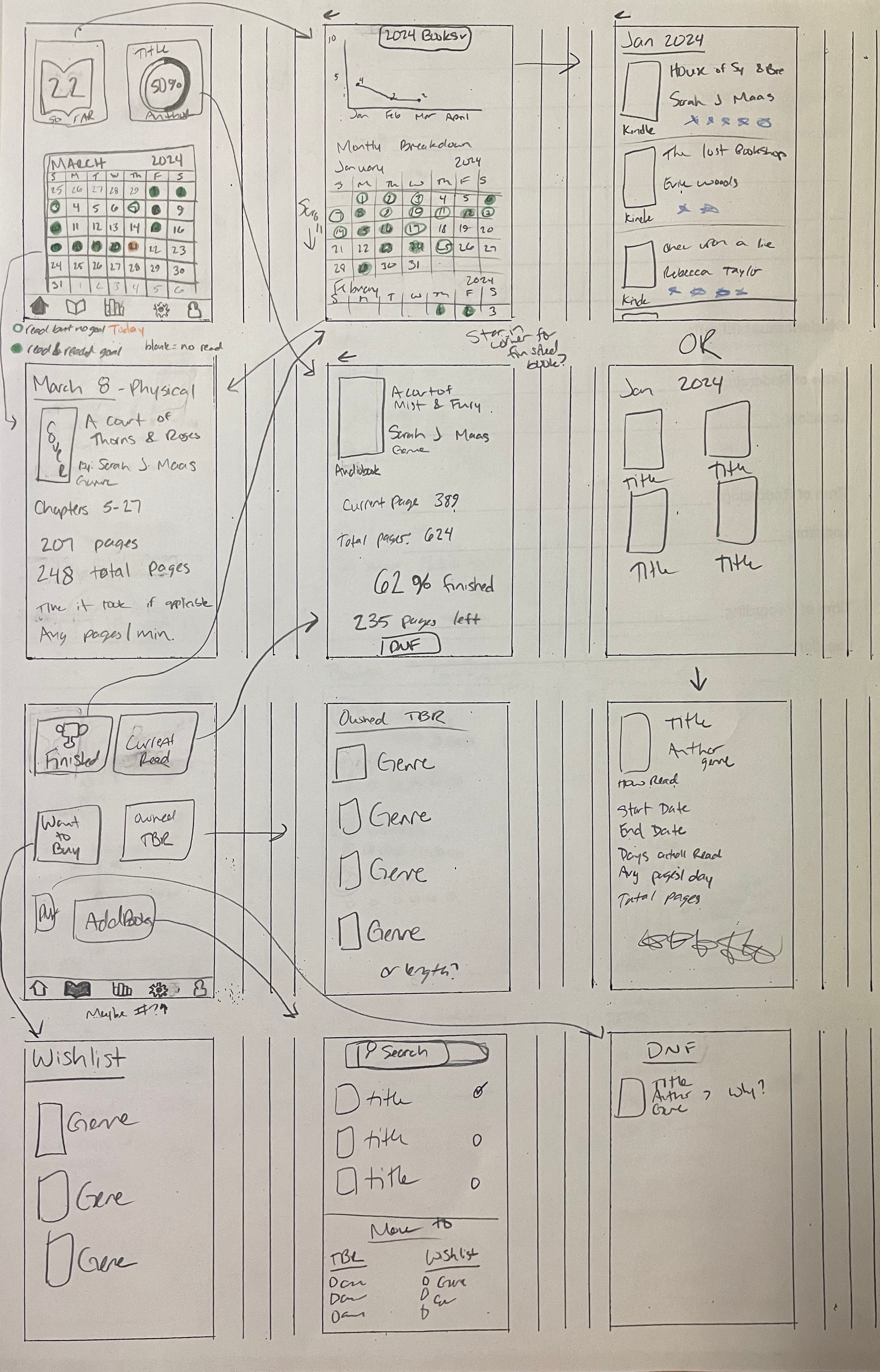 These are the concept sketches I drew before I created my Figma wireframes. I have more pages and details I would have added to the final app if it were going into development, but for the sake of the assignment I tried to keep what I did less complex for the time restraints. I have slowly been adding on to my original 8 wireframes, and would like to eventually round this out to be complete. The main mechanisms I haven’t added yet are a DNF (did not finish) page where the user can speak to why they didn’t enjoy a book.I also want to add a goal maker and tracker that the user is able to toggle on and off depending on if they are the type of reader to try to reach goals or are a more casual reader just looking to see their statistics. I would also like to add two TBR (to be read) lists, one for books the user already owns, and another for books the user would like to purchase.