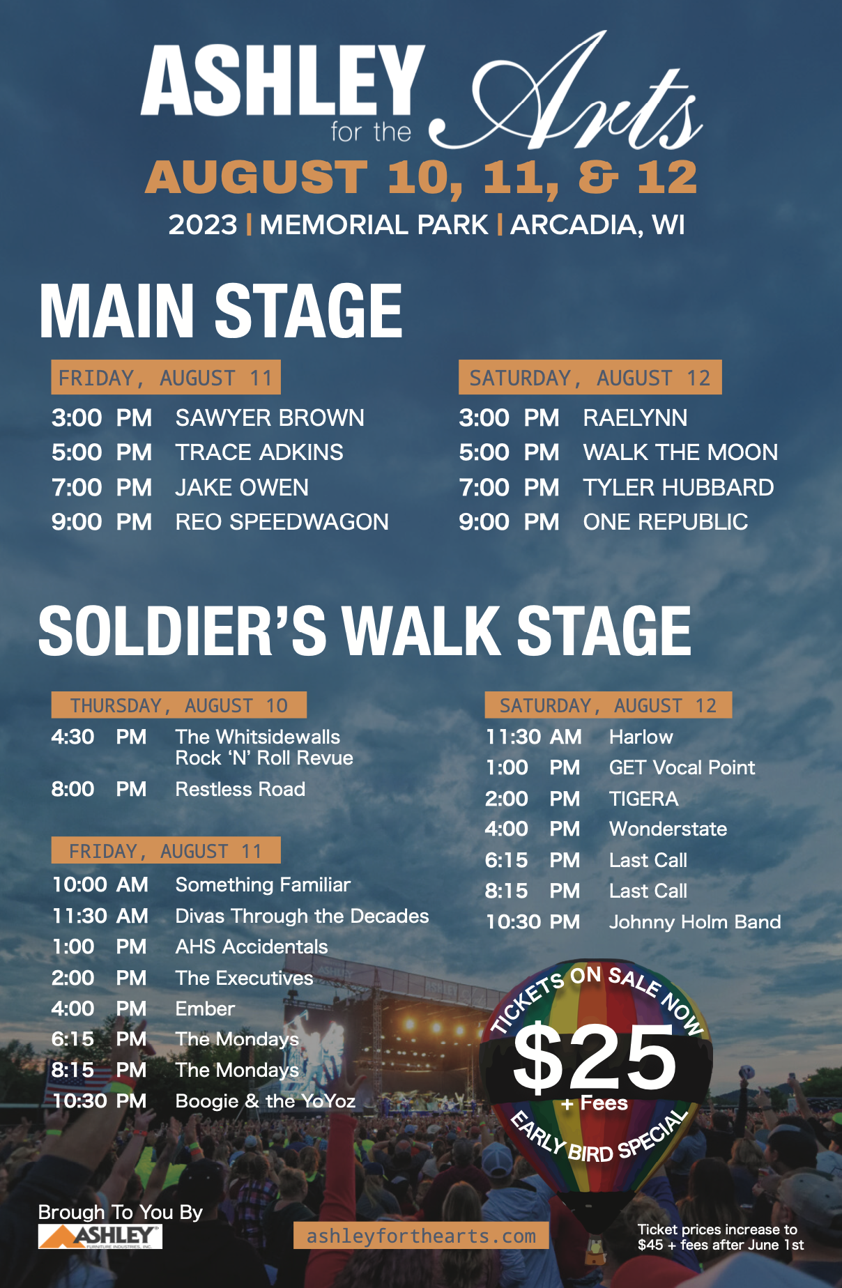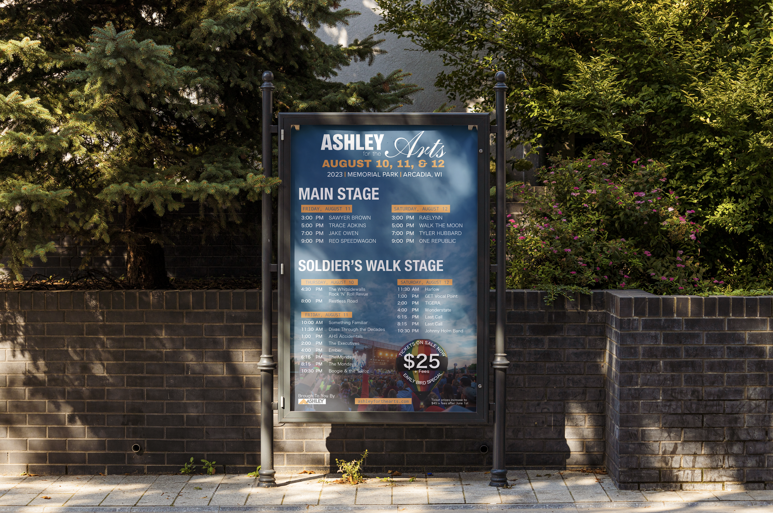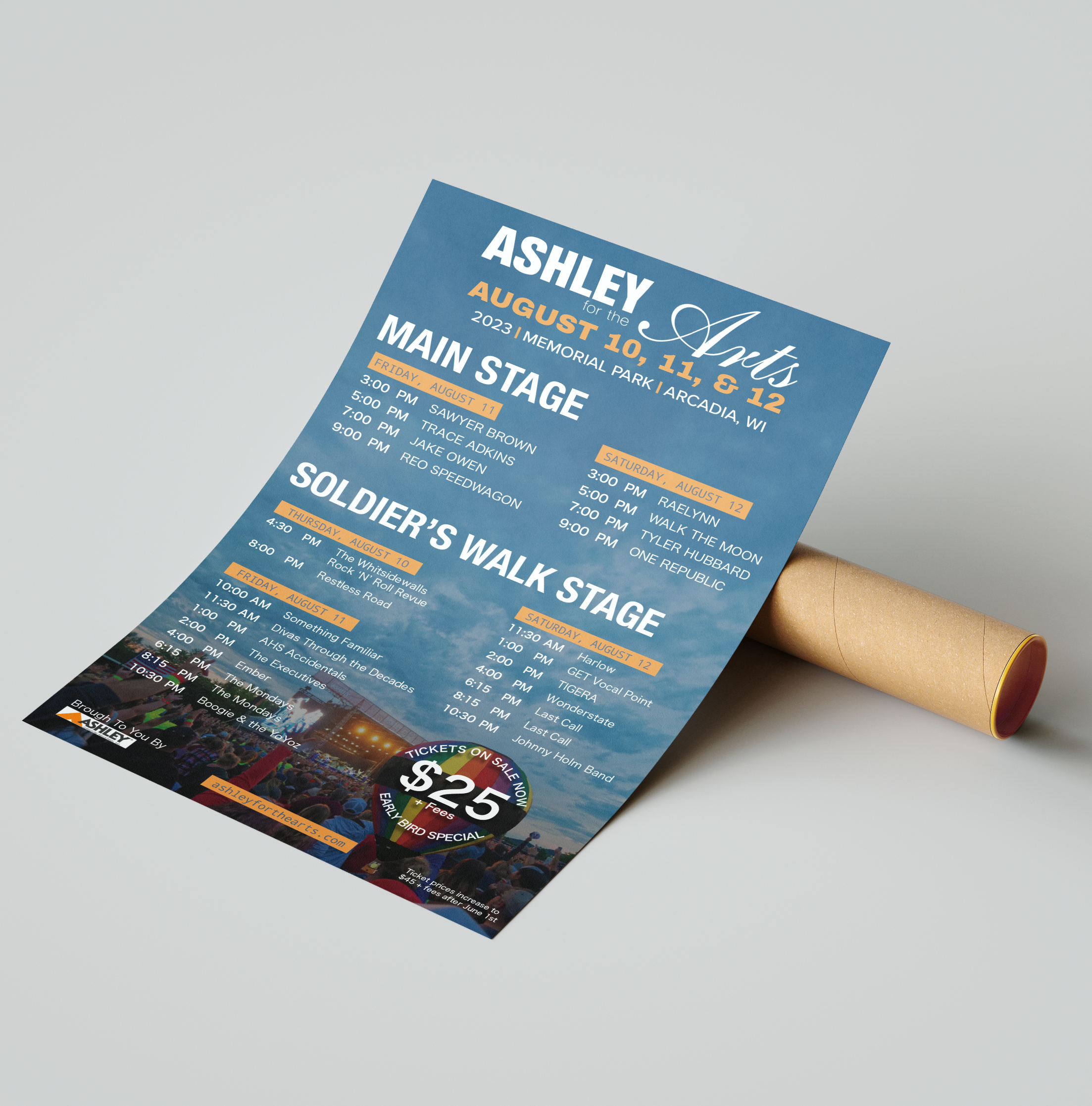 Ashley for the Arts is a weekend long concert festival put on by Ashley Furniture in their home base city Arcadia, WI. The tickets to this festival are incredibly affordable, and all profit not used to pay the performing artists goes towards funding music and art programs in schools. The event is also vended by local small businesses. I used photoshop to expand the background image, Illustrator to image trace the hot air balloon, and InDesign to layout all of the event information.